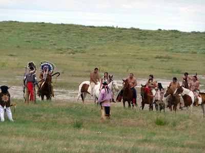 Although the day started out with some dark clouds in the sky, here in Billings, MT, the day turned out to be a beautiful one. The highlights of the day were Kathy's Birthday, and the Reenactment of Custer's Last Stand at the Battle of Little Bighorn. After Linda and I had our nails done at WalMart (the best job we have ever had done), we drove 46 miles then a couple of miles on dirt roads, to this field and hill in the middle of no-where, somewhere near Hardin, but not at the original site of the Battle. About a one hour reenactment of the history between the Indians and the Whites, the deterioration of their relationships and then the big battle. While we expected it to be either a bit amateurish or corney, it was neither and was well done, and obviously of great pride to the small town of Hardin. The horses and their riders were awesome. The little children (actors) behaved very well. Unfortunately, we never made it to the official site of the Little Big Horn National Monument. After it was over, we rushed back to Billings to finalize the birthday party for Kathy, only to find that the place we thought we had reserved, didn't have us down, and it really wasn't in a part of town we wanted to be in at night with our Morgans. So I searched around for restaurants close to our hotel- C'mon In- and none could handle a party of 27 at 7:30 PM. Ultimately, our hotel had a room we could use, I ordered Chinese takeout, ran to Costco for a birthday cake, and we had a wonderful party here. Although I wasn't able to take any pictures of Kathy, I will get one to use. Back to the room to do a bit of handwash, since we didn't seem to have time to get to the laundry today, Philip is asleep and I am trying to catch up on my blog before falling asleep myself.